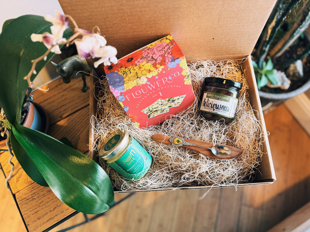 Step one is to start with an elegant and sophisticated base and Flouwer Co’s artisanal flower crackers are all WOW. The stage is set. Step two is to spread a thin layer of SunGhee’s clarified sage and rosemary infused ghee on that canvas. You can stop here and it would be mighty delicious but we like to add a small drop of Deliciousness over top for a yummy sweet and savory moment of bliss. Delicious.